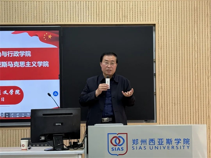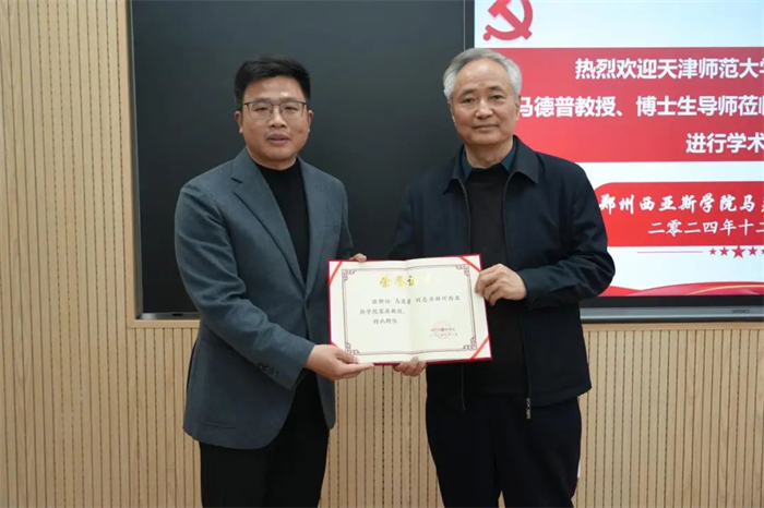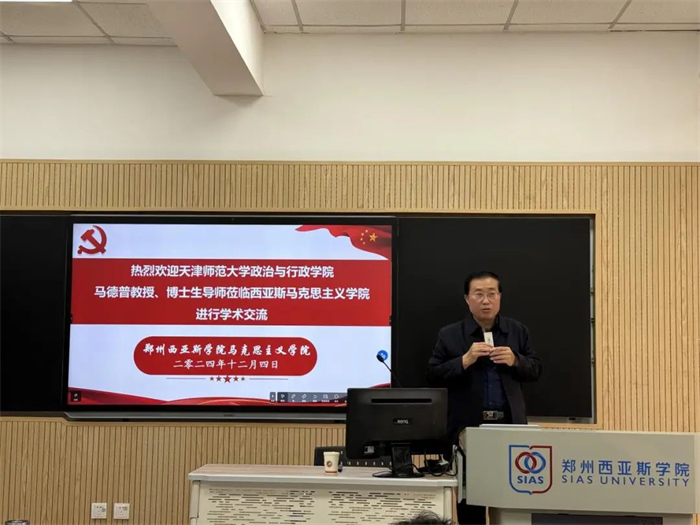 為(wei) 加強學術交流,拓寬學術視野,深化對中國式現代化問題的研究,進一步提高馬院思政課教師的理論水平和教學科研能力,2024年12月4日,天津師範大學政治與(yu) 行政學院教授、博士、博士生導師馬德普受邀到鄭州西亞(ya) 斯學院馬克思主義(yi) 學院進行學術交流,在2號教學樓202智慧報告廳作題為(wei) 《全麵準確地認識中國式現代化道路》的專(zhuan) 題學術報告。鄭州西亞(ya) 斯學院黨(dang) 委副書(shu) 記、常務副校長、工會(hui) 主席吳華出席學術報告會(hui) ,並在會(hui) 前與(yu) 馬德普教授進行深入交談,為(wei) 其頒發“客座教授”榮譽證書(shu) 。學術報告會(hui) 由馬克思主義(yi) 學院院長郭學德教授主持,馬院全體(ti) 思政課教師共同聆聽學習(xi) 。