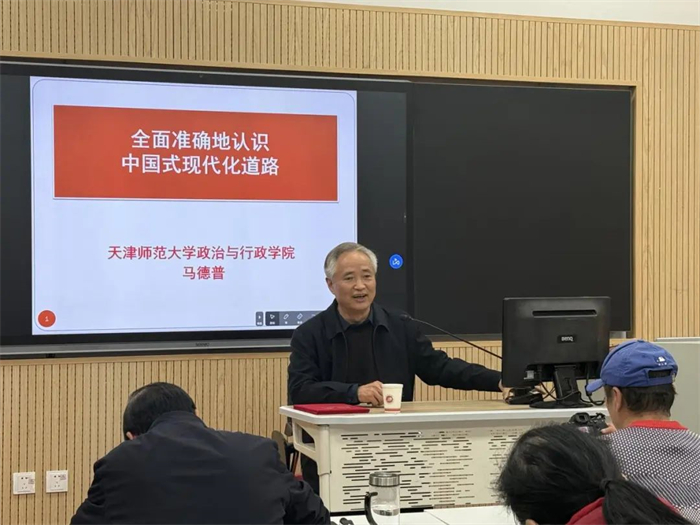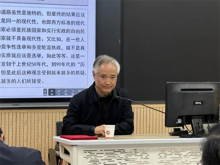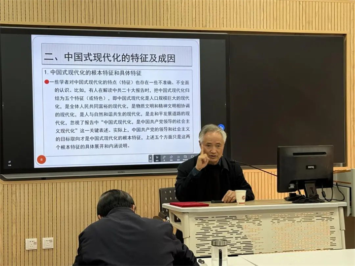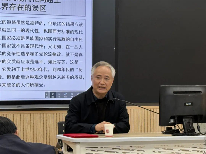 馬德普教授圍繞“全麵準確地認識中國式現代化道路”這一主題,從(cong) “在認識中國式現代化問題上中國思想界存在的誤區”“中國式現代化的特征及成因”“中國式現代化的優(you) 勢與(yu) 不足”三個(ge) 方麵,進行了深入論述和闡釋。