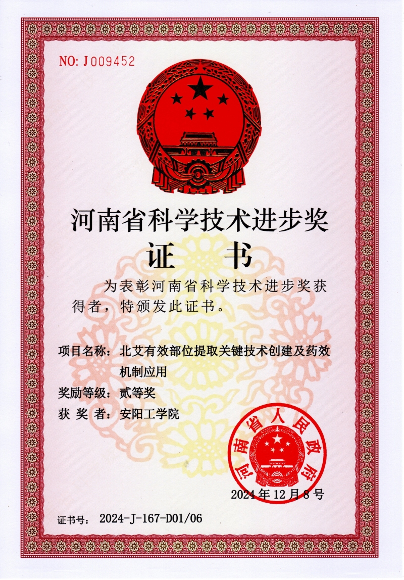 12月9日,河南省科學技術獎勵大會(hui) 在鄭州隆重舉(ju) 行,對2024年度河南省科學技術傑出貢獻獎獲獎者和自然科學獎、技術發明獎、科學技術進步獎獲獎者進行表彰。安陽工學院主持完成的《北艾有效部位提取關(guan) 鍵技術創建及藥效機製應用》項目獲河南省科學技術進步二等獎。