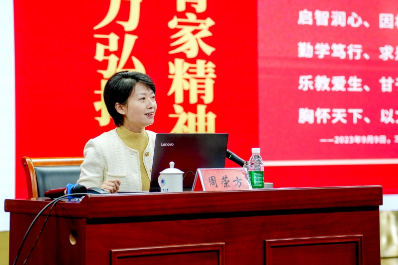周榮方以《播種者不急於(yu) 收獲》為(wei) 主題,從(cong) “為(wei) 什麽(me) 站在講台上”“站在講台上講什麽(me) ”“站在講台怎麽(me) 講”三個(ge) 方麵,用“看見·相信”闡釋至誠報國的理想信念,用“能力·動力”講述求是創新的躬耕態度,用“複製·傳(chuan) 承”分享言傳(chuan) 身教傳(chuan) 遞信仰的力量。她用自己深耕教壇近20年的生動實踐,向在座師生展示了教師的“篤行”不是“獨行”,而是與(yu) 學生的“同行”,人生不能複製,但是力量可以傳(chuan) 承的職業(ye) 信仰。她以自身傳(chuan) 承紅色基因、踐行“教育家精神”的實際行動,感召教育工作者要做習(xi) 近平新時代中國特色社會(hui) 主義(yi) 思想的堅定信仰者、積極傳(chuan) 播者、忠實實踐者。要用更大的耐心、更多的等候,在青年學生心中播下希望的種子,做不急於(yu) 收獲的播種者,讓他們(men) 的青春在全麵建設社會(hui) 主義(yi) 現代化國家進程中綻放絢麗(li) 之花!