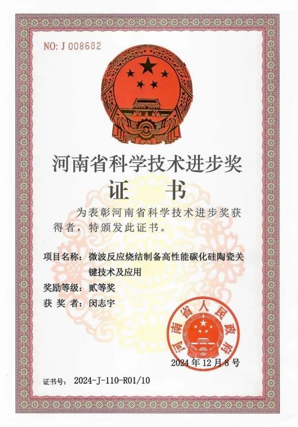 12月9日,省委、省政府在鄭州隆重舉(ju) 行全省科學技術獎勵大會(hui) ,對2024年度省科學技術獎獲獎者進行表彰。河南機電職業(ye) 學院閔誌宇教授作為(wei) 第一完成人的《微波反應燒結製備高性能碳化矽陶瓷關(guan) 鍵技術及應用》項目,榮獲2024年度河南省科學技術進步獎二等獎,這是河南機電職業(ye) 學院教師主持完成的項目首次獲得該獎項二等獎。