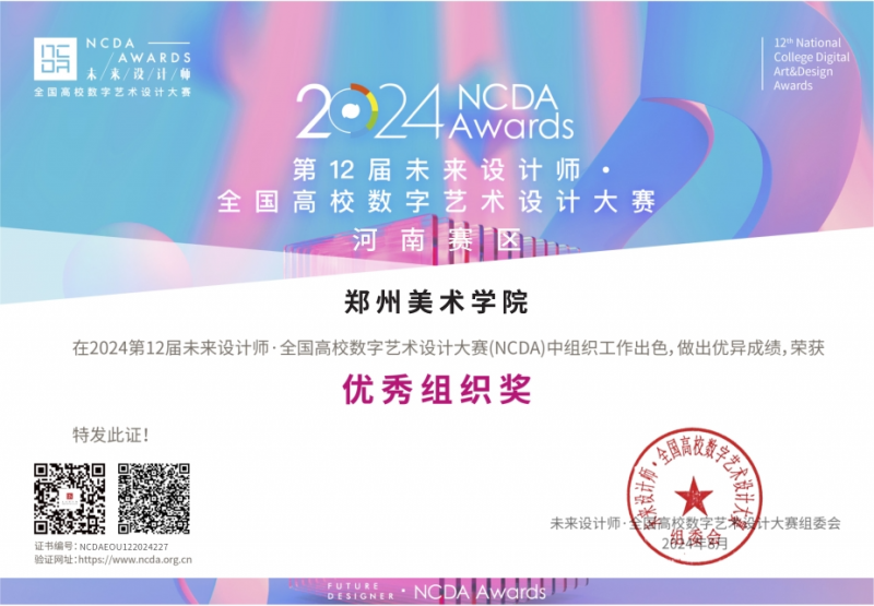 近日,2024第12屆未來設計師·全國高校數字藝術設計大賽(NCDA)國賽獲獎名單公布,鄭州美術學院全國總決(jue) 賽獲獎6項作品,其中,一等獎2項,二等獎2項,三等獎2項;河南省賽獲獎30項作品,其中,一等獎8項,二等獎9項,三等獎13項,並榮獲優(you) 秀組織單位。