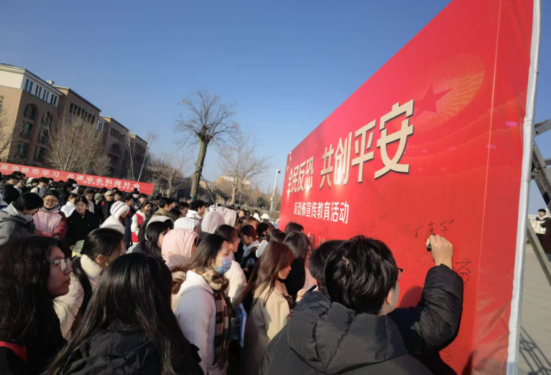 在“全民反恐 共創平安”簽名牆前,師生排起長隊,依次拿起筆,鄭重地在簽名牆上寫(xie) 下自己的名字,這一舉(ju) 動象征著他們(men) 對反恐行動的支持和參與(yu) 反恐工作的決(jue) 心。