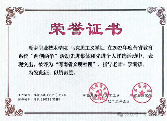 以社團活動、社會(hui) 實踐等方式彰顯育人成效,各類學生社會(hui) 實踐活動紮實開展,馬克思主義(yi) 學社喜獲“河南省文明社團”,育人效果不斷得到彰顯;以理論宣講、結對共建等方式深耕社會(hui) 服務,四名黨(dang) 員教師先後走進十餘(yu) 個(ge) 企事業(ye) 單位進行理論宣講,與(yu) 河南省第二監獄共建校外思政教育基地,完成意義(yi) 特殊的幫教活動。