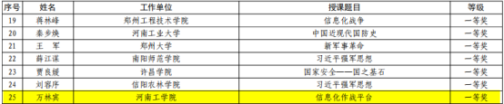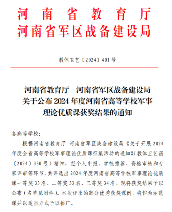 近日,kaiyun体育登入口、河南省軍(jun) 區戰備建設局公布關(guan) 於(yu) 2024年度高等學校軍(jun) 事理論優(you) 質課評選活動比賽結果,河南工學院軍(jun) 事課教師萬(wan) 林賓的《信息化作戰平台》榮獲全省軍(jun) 事理論優(you) 質課比賽一等獎,同時被評為(wei) 優(you) 質課示範課。