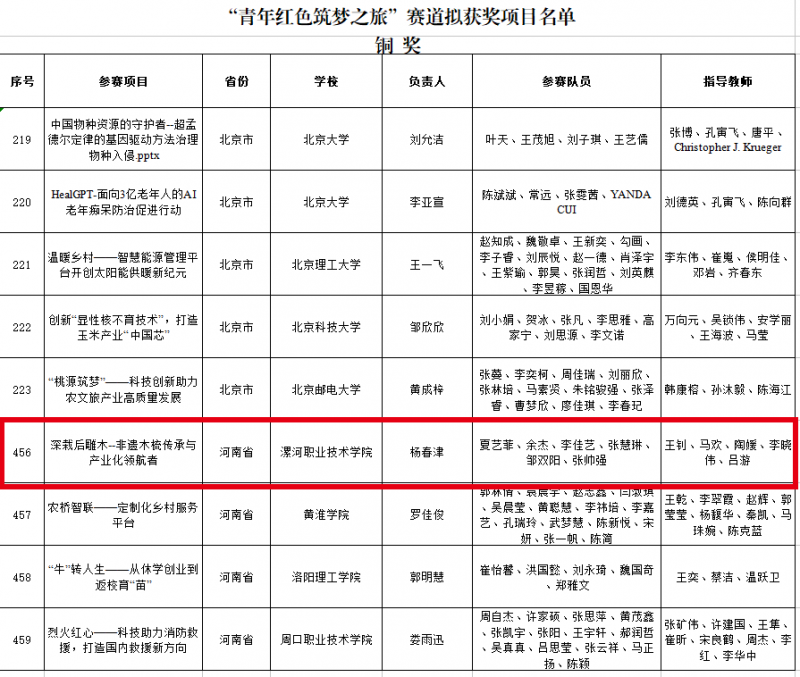 近日,教育部公示了中國國際大學生創新大賽(2024)的獲獎項目名單。漯河職業(ye) 技術學院參賽項目《深栽後雕木——非遺木梳傳(chuan) 承與(yu) 產(chan) 業(ye) 化領航者》、《豐(feng) 景科技——中國智能設備安裝服務專(zhuan) 家》成功入圍國家級總決(jue) 賽,其中《深栽後雕木——非遺木梳傳(chuan) 承與(yu) 產(chan) 業(ye) 化領航者》項目進一步榮獲“青年紅色築夢之旅”賽道銅獎,實現曆史性突破。