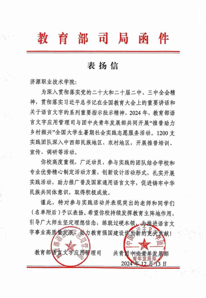 近日,濟源職業(ye) 技術學院收到由教育部語言文字應用管理司、共青團中央青年發展部聯合發來的表揚信,表揚在2024年“推普助力鄉(xiang) 村振興(xing) ”全國大學生暑期社會(hui) 實踐誌願服務活動中獲得優(you) 秀團隊。
