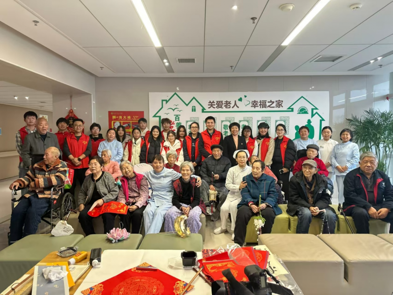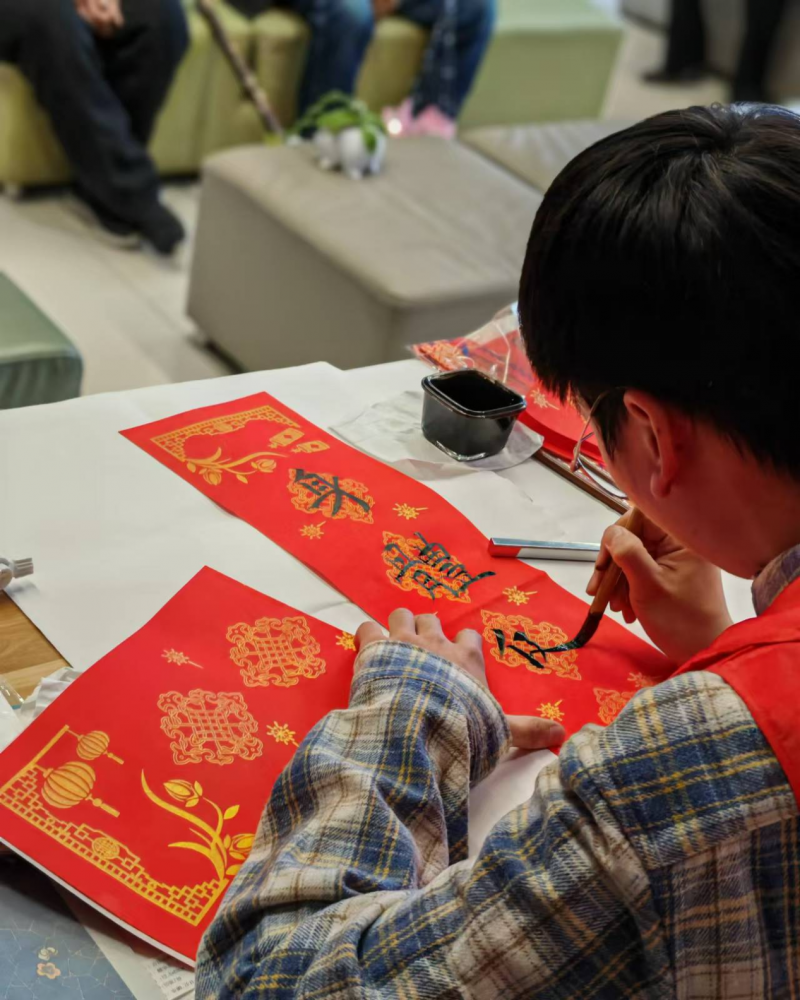 之後,同學們(men) 鋪紙研墨,為(wei) 老人們(men) 寫(xie) 對聯、題福字。筆鋒婉轉間,一個(ge) 個(ge) 飽含美好祝福的文字躍然紙上。對聯上,既有對老人們(men) 健康長壽的誠摯祈願,又有對療養(yang) 中心生活祥和美滿的由衷讚美。