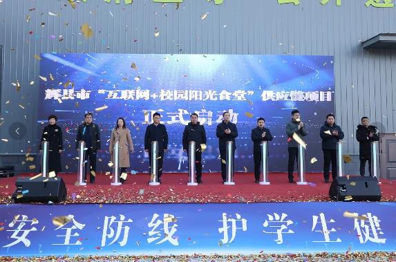 儀(yi) 式上,與(yu) 會(hui) 領導宣布輝縣市“互聯網+校園陽光食堂”供應鏈項目正式啟動。