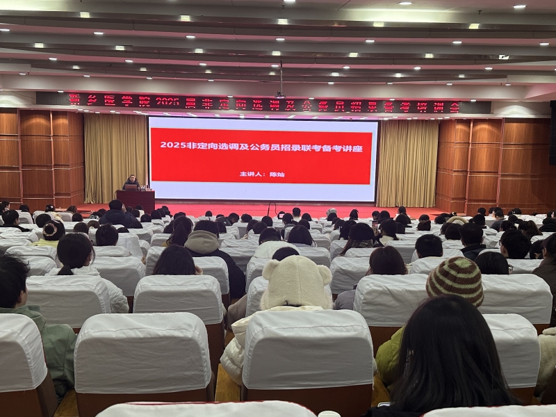 1月2日,新鄉(xiang) 醫學院在博學樓第一報告廳舉(ju) 辦2025年河南省非定向選調、公務員招錄備考培訓會(hui) 。本次培訓旨在助力學校2025屆畢業(ye) 生順利備戰選調公考,掌握備考技巧,明確考試內(nei) 容與(yu) 發展前景,實現高質高效備考。
