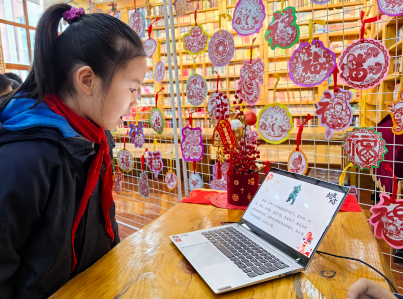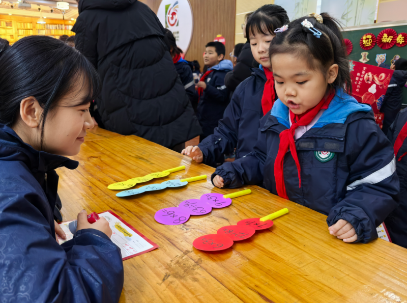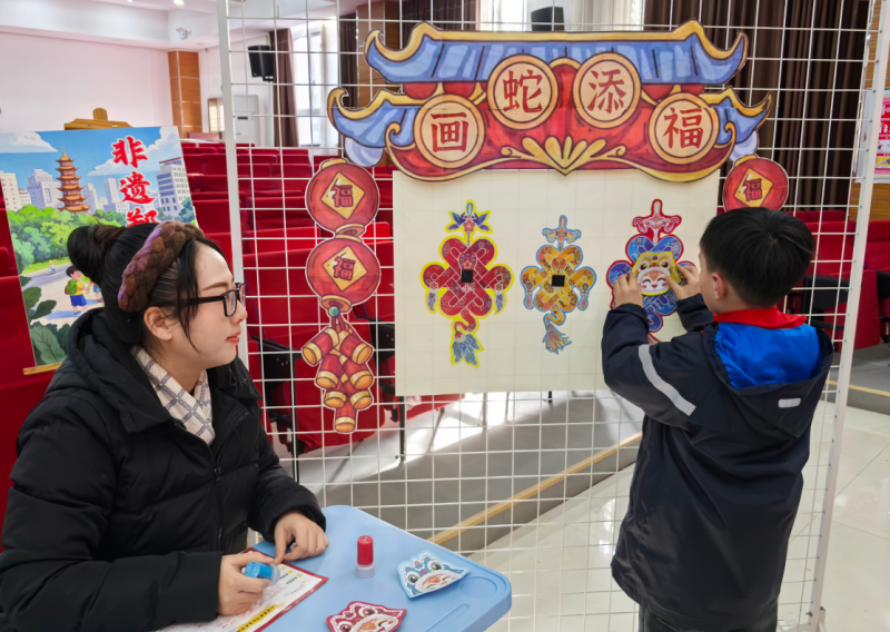 剪紙、布老虎、麵塑、木版年畫作為(wei) 國家非物質文化遺產(chan) 和傳(chuan) 統民間藝術,有著悠久的曆史,一年級語文學科集思廣益、將非遺文化與(yu) 語文學科的字詞積累、美文誦讀、經典背誦、口語交際等內(nei) 容巧妙結合,突出學科特點,強化知識運用,讓學生收獲知識的同時,獲得自我價(jia) 值的認同感。二年級美術學科以“畫蛇添福·春節中國結”為(wei) 主題,設計“三原色的奧秘”“蛇寶喜迎新春”,考驗孩子們(men) 的構圖技巧,鍛煉動手實踐能力。
