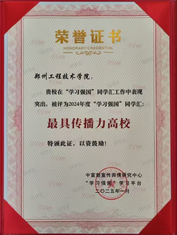 近日,經“學習(xi) 強國”學習(xi) 平台評選,鄭州工程技術學院獲中宣部輿情研究中心和“學習(xi) 強國”學習(xi) 平台共同頒發的2024年度“最具傳(chuan) 播力高校”榮譽稱號,同時,還獲評“學習(xi) 強國”同學匯2024年度人氣作品兩(liang) 項,在獲獎層次和獲獎數量上實現了新突破,在河南高校中名列前茅。