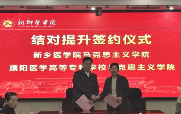 為(wei) 深入學習(xi) 貫徹習(xi) 近平總書(shu) 記關(guan) 於(yu) 思政課建設的重要指示精神,全麵推進新時代馬克思主義(yi) 學院建設與(yu) 思政課程內(nei) 涵式發展,根據省委宣傳(chuan) 部、省委教育工委、省教育廳的相關(guan) 要求,1月10日,濮陽醫學高等專(zhuan) 科學校馬克思主義(yi) 學院與(yu) 新鄉(xiang) 醫學院馬克思主義(yi) 學院結對提升簽約儀(yi) 式在新鄉(xiang) 醫學院成功舉(ju) 辦。