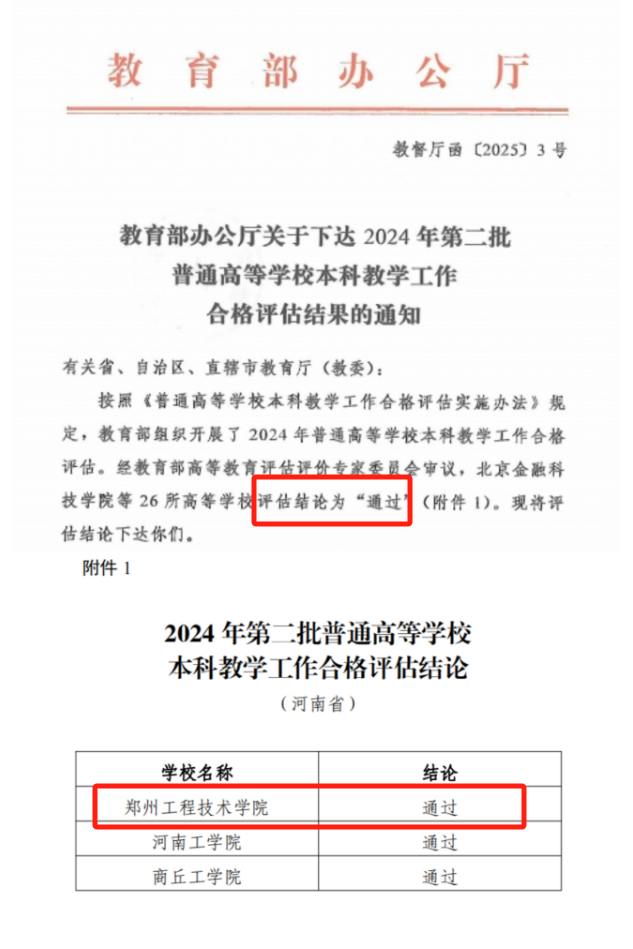 近日,教育部辦公廳下發《關(guan) 於(yu) 下達2024年第二批普通高等學校本科教學工作合格評估結果的通知》,經教育部高等教育評估評價(jia) 專(zhuan) 家委員會(hui) 審議,鄭州工程技術學院本科教學工作合格評估結果為(wei) “通過”。這標誌著該校本科教育教學工作邁上新台階,學校人才培養(yang) 質量和辦學水平實現了新跨越,在學校發展史上具有裏程碑意義(yi) 。