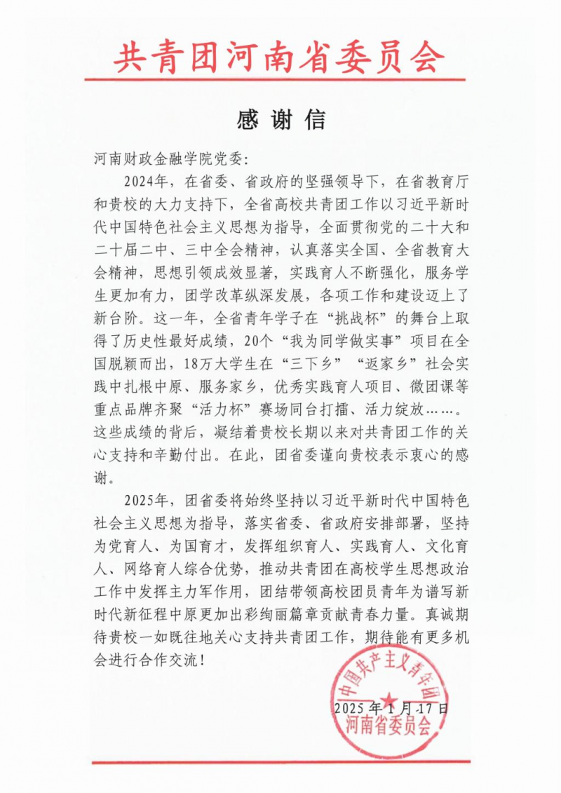 近日,共青團河南省委員會(hui) 向河南財政金融學院黨(dang) 委發來感謝信,對該校長期以來高度重視共青團工作,積極落實上級部署,強化思想引領,加強實踐育人,服務學生成長,推進團學改革,開展“三下鄉(xiang) ”“返家鄉(xiang) ”社會(hui) 實踐活動等,為(wei) 推動2024年全省共青團工作取得優(you) 異貢獻表示衷心感謝。