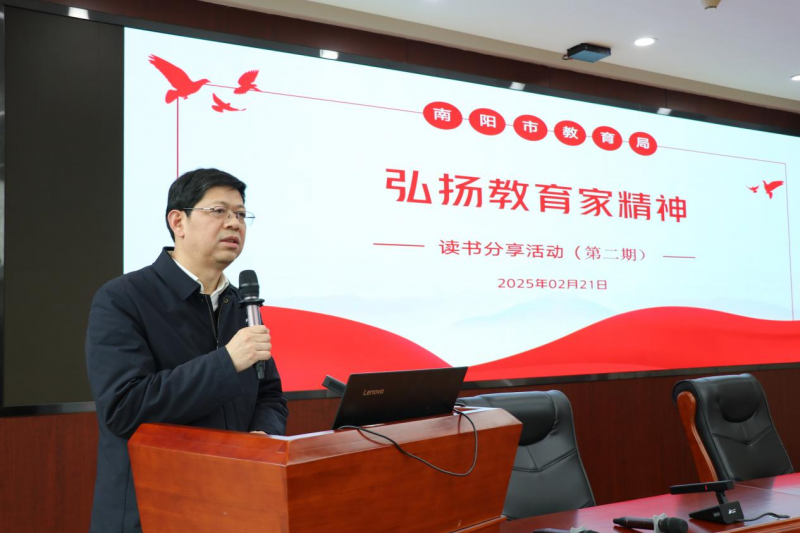 一年之計在於(yu) 春,開卷讀書(shu) 正當時。2月21日,南陽市教育局舉(ju) 辦“弘揚教育家精神”讀書(shu) 分享活動。南陽市政協副主席,市教育局黨(dang) 組書(shu) 記、局長楊文普出席會(hui) 議並講話,南陽市教育局領導班子成員、四級調研員,局屬二級單位領導班子成員和局機關(guan) 全體(ti) 同誌參加會(hui) 議。