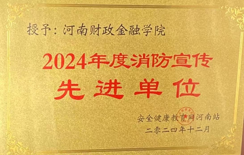 近日,中國安全健康教育網河南站對“2024年度消防宣傳(chuan) 先進單位”進行了表彰,河南財政金融學院被授予“2024年度消防宣傳(chuan) 先進單位”榮譽稱號,保衛處副處長趙磊、消防科李建民被評為(wei) “河南省消防宣傳(chuan) 先進個(ge) 人”。